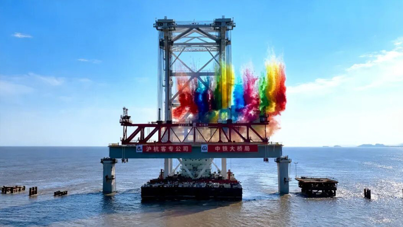 9月27日15時,隨著“天一號”運架一體船與巨力索具預制箱梁吊具將重達2800噸的新一代“世界梁王”在杭州灣海域順利架設,世界最長高速鐵路跨海大橋——杭州灣跨海鐵路大橋全面進入架梁施工新階段,為后續(xù)大規(guī)模開展海上架梁作業(yè)打下了堅實基礎。