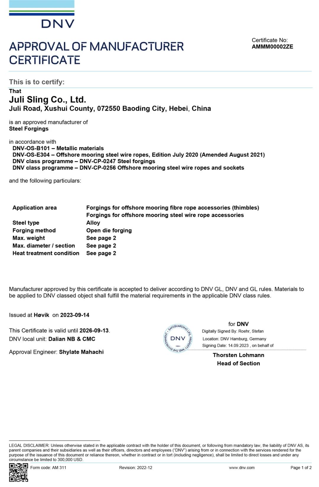 (DNV長(zhǎng)期系泊鋼絲繩接頭及纜繩套環(huán)鍛件工廠認(rèn)可證書)