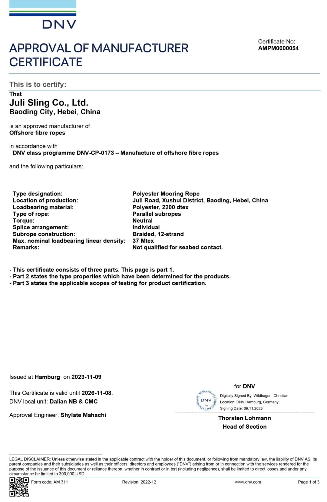 (DNV長(zhǎng)期系泊纜繩(滌綸)工廠認(rèn)可證書)