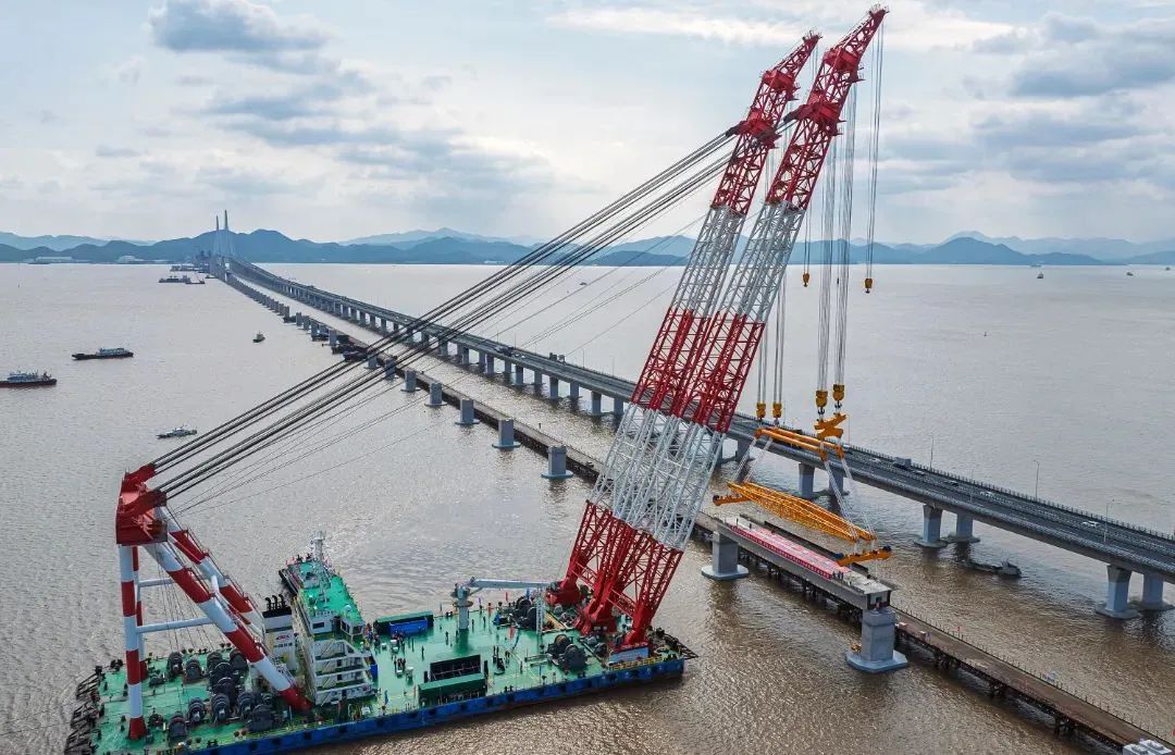 大橋海上架設(shè)預(yù)制箱梁共66榀,每榀梁長(zhǎng)60米,寬10.6米,重約1700噸,吊具重280噸,總體起吊總重1980噸,是國內(nèi)市域(郊)鐵路工程跨度最大、噸位最重的預(yù)應(yīng)力混凝土預(yù)制箱梁。