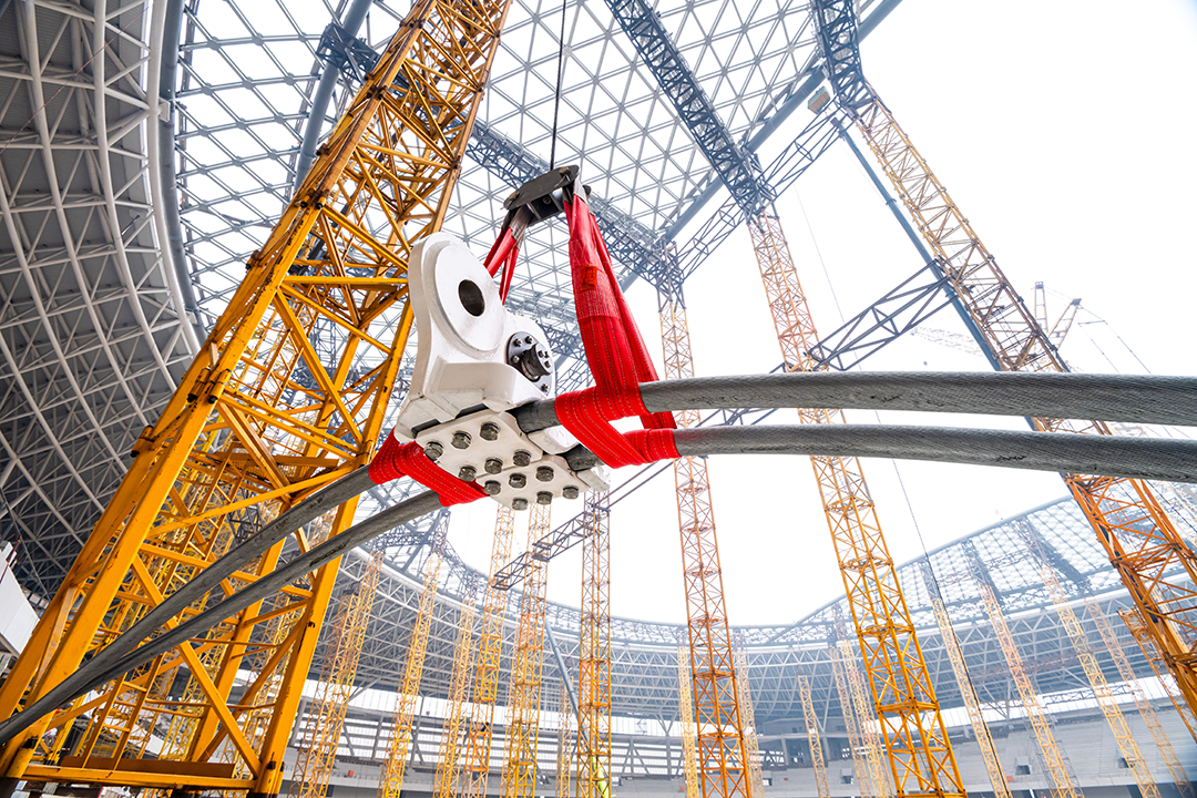 在施工過程中,巨力索具對體育中心徑向索與環梁部位采用了測力銷釘技術(具有拉索索力實時監測功能,可實現體育場施工及運營期間的索力監測),融合單層網殼與索承張拉技術,4700噸鋼結構屋蓋整體吊升,施工時在地面組裝完成,56小時毫米級精準落位,刷新國內體育場館施工紀錄。