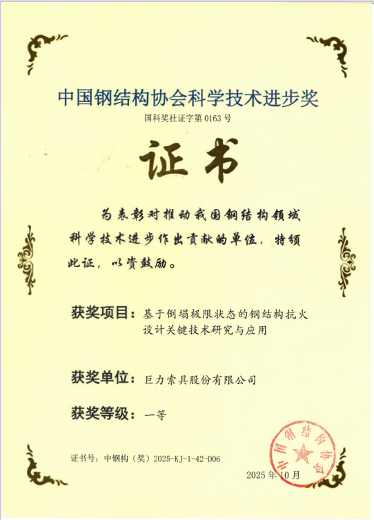 本次巨力索具獲獎的三項技術成果,覆蓋抗火安全、新材料應用、智能監測與新型結構體系應用等多個前沿方向,體現了公司在索具系統集成化、智能化、高性能化發展道路上的全面突破。