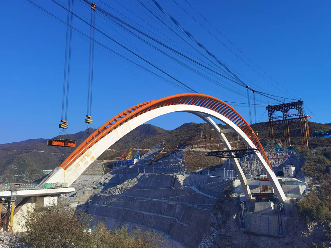 涇河大橋全長284米,主橋跨徑274.7米,拱橋景觀平臺寬37米,最大安裝高度70米。該橋摒棄傳統二維拱肋結構形式,創新采用單雙結合、主副拱聯合受力的空間三維曲線拱模式,是我國首例采用中承式空間Y型鋼箱拱橋設計施工的橋梁工程。
