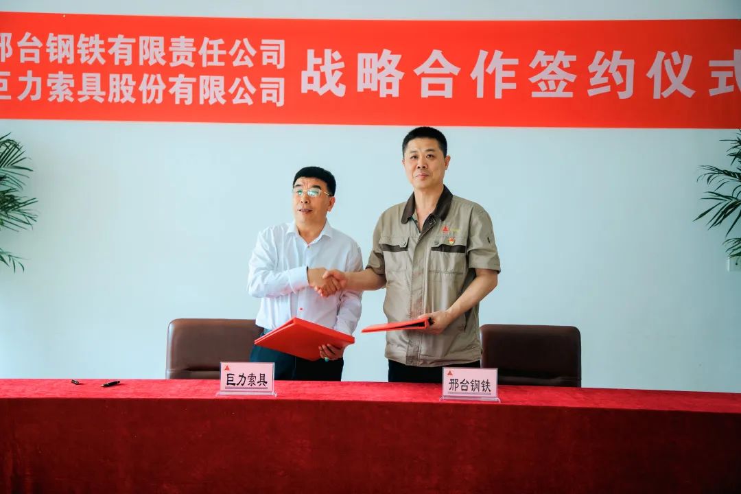 2023年6月19日,巨力索具與邢臺鋼鐵簽訂戰略合作協議,邢臺鋼鐵董事長張育明,巨力索具董事長楊建國、總裁楊超出席簽約儀式,并就合作情況展開詳細座談。